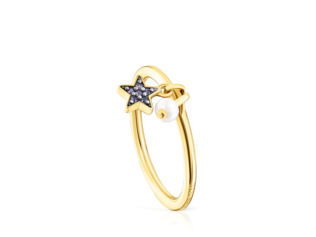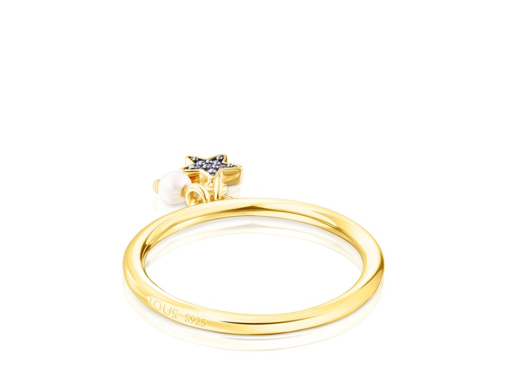 Prsten TOUS New Motif z pozlaceného stříbra s hvězdou z modrého safíru o velikosti 5,1 × 5,32 mm a perlou o průměru 3 mm. Tloušťka prstenu: 1,5 mm.Doplňkové parametry