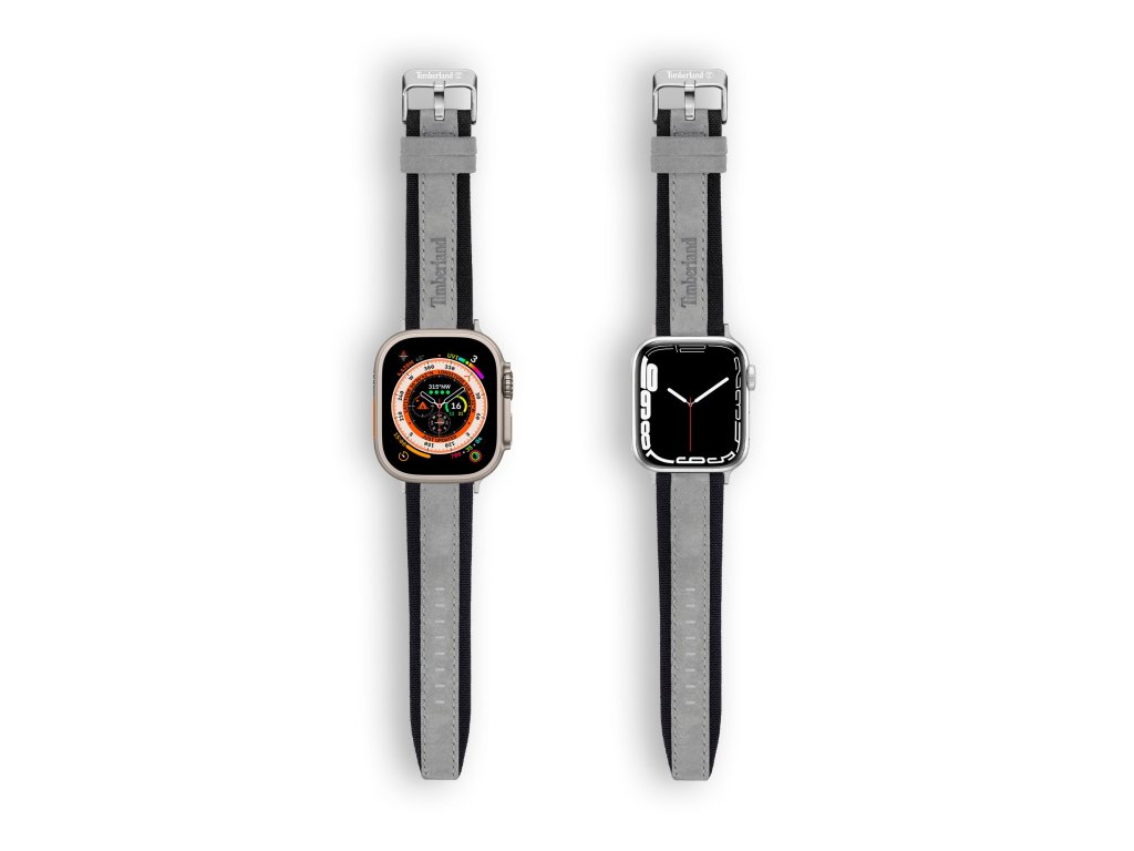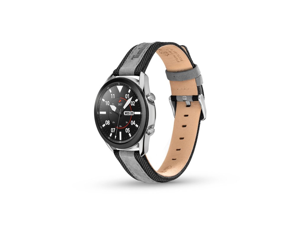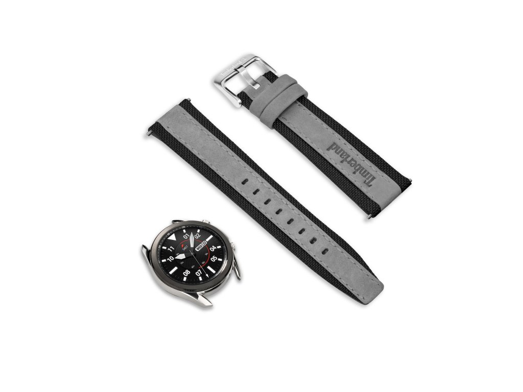 Univerzální řemínek Timberland Arnett kombinuje světle šedou kůži a černý materiál ReBOLT z recyklovaných PET lahví a je kompatibilní s chytrými i klasickými analogovými hodinkami.