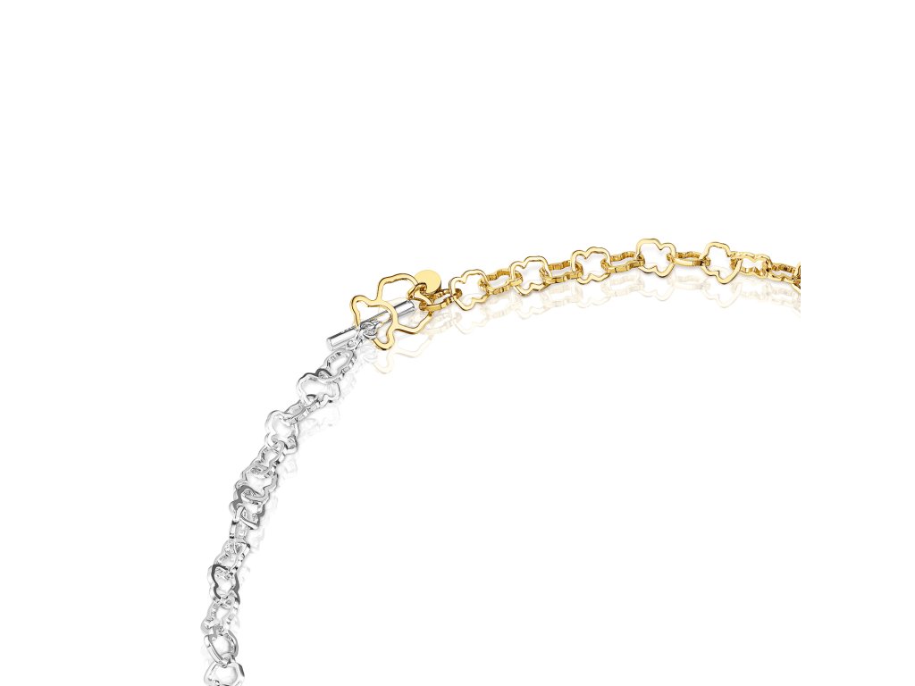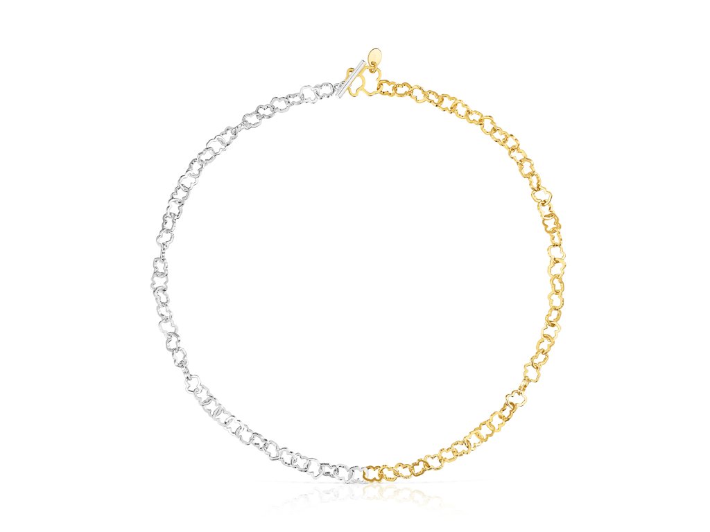 Obojkový náhrdelník TOUS Carrusel z pozlaceného stříbra a mincového stříbra s kroužky s motivem medvídka. Délka: 43 cm. Zapínání pomocí tyčinky. Technologie výroby: odlévání.Doplňkové parametry