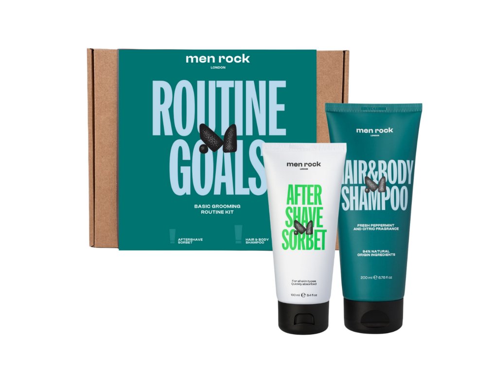 Darčekový set kozmetiky od Men Rock obsahuje základné produkty dennej starostlivosti o pleť a telo pre mužov, after shave a šampón.