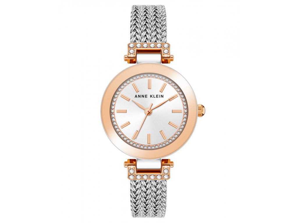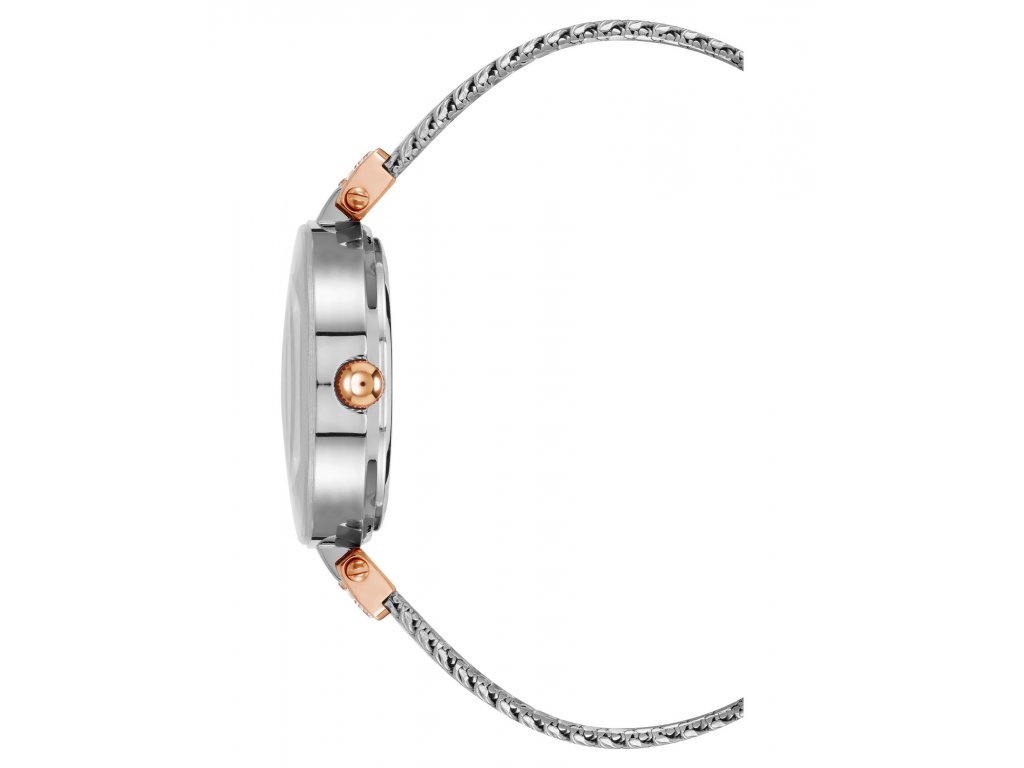 Dámske náramkové hodinky. Strieborné puzdro bez obsahu niklu zdobí ružovo-zlatá korunka. Ciferník je strieborný s kryštálmi, luneta je ružová. Oceľový náramok v "mesh" farbe v dvojfarebnom striebornom a ružovom zlate. Vodotesnosť 30M.Dodatočné parametre
