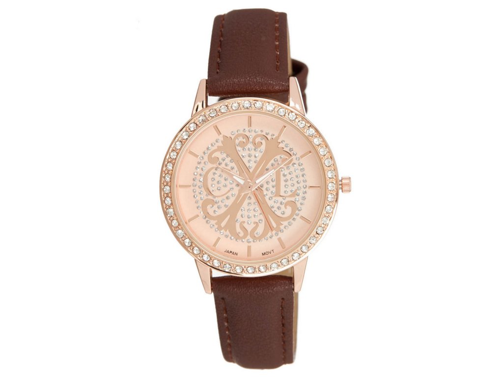 Tieto dámske hodinky s hnedým remienkom majú na ciferníku veľké logo CXL, sú celé pozlátené ružovým zlatom a na lunete zdobené sklenenými kamienkami.Dodatočné parametre