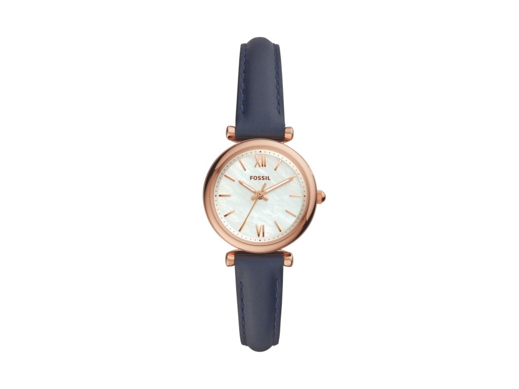 Dámske hodinky Fossil Carlie v mini prevedení oslovia ženy, ktoré milujú jemné a štýlové doplnky. Kombinácia perleťového ciferníka, elegantného modrého koženého remienka a ružovozlatého puzdra vytvára harmonický celok vhodný ako na bežné nosenie, tak aj na formálnejšie príležitosti.