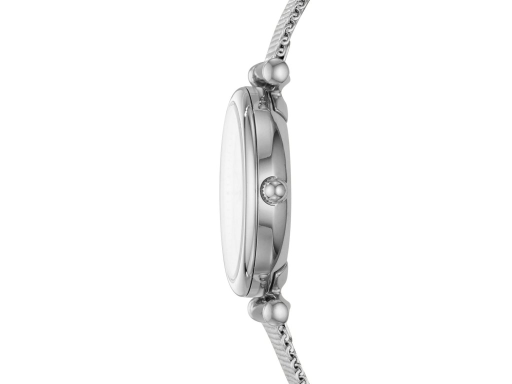 Malý perleťový ciferník s priemerom 28 mm je zasadený do úzkeho okrúhleho puzdra, ktorého lesk vás očarí. Z ciferníka vystupujú nadčasové indexy a logo značky umiestnené v hornej časti ciferníka. Oceľové ťahadlo so sieťovinou striebornej farby sa skladá z drobných článkov, ktoré jemne upozorňujú na detailnú prepracovanosť tohto výrobku.