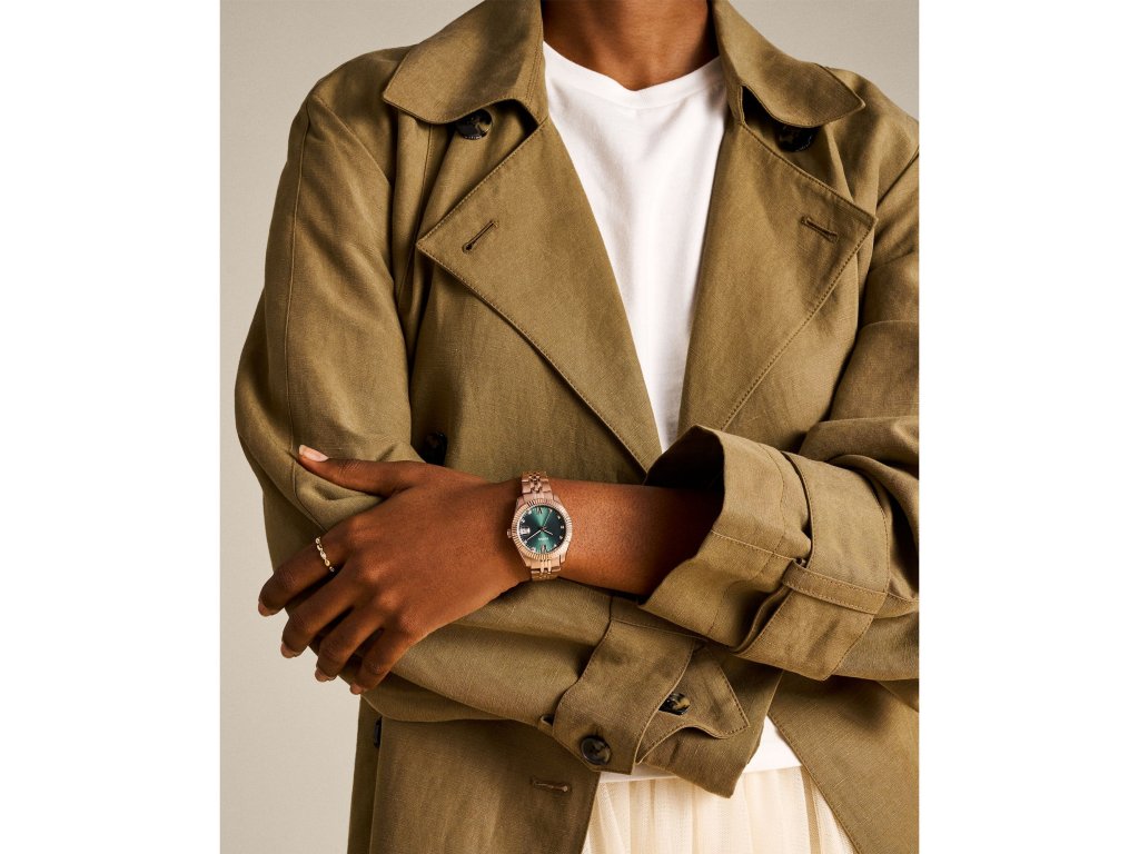 Zelená farba menšieho ciferníka s priemerom 32 mm v kombinácii s okrúhlym puzdrom z ružovozlatej nehrdzavejúcej ocele je jedinečná. Ciferníku dominuje praktická dátumovka, dizajnové ručičky a nadčasové indexy s kryštálmi. Oceľový ťah s ostatnými prvkami veľmi pekne ladí a dotvára vizuálny dojem tohto doplnku.