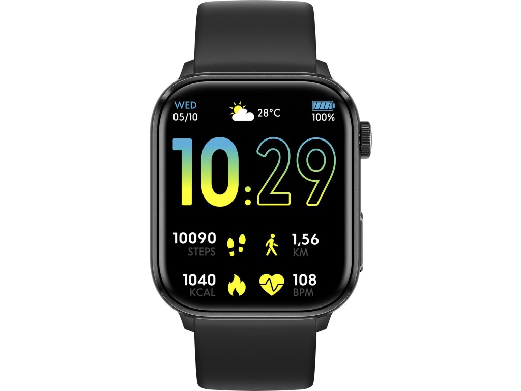 Tieto elegantné hodinky s čiernym silikónovým remienkom sú ľahké, pohodlné a perfektne sedia na zápästí. Hranaté hliníkové puzdro s displejom AMOLED s vysokým rozlíšením 410 × 502 px a uhlopriečkou 49 mm zaručuje skvelú viditeľnosť všetkých funkcií aj počas jasného dňa. Farebné ručičky na tmavom displeji vyniknú veľmi decentne. Minimalistický dizajn týchto hodiniek sa hodí ku každému oblečeniu, či už športovému alebo elegantnému.