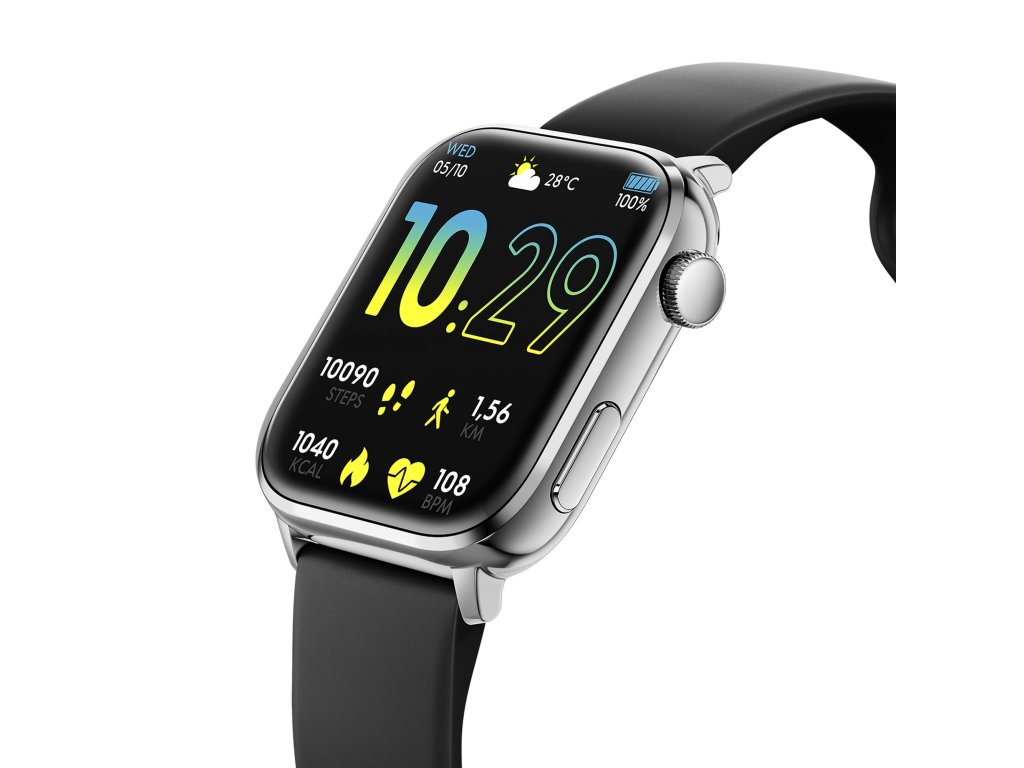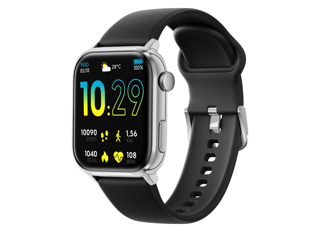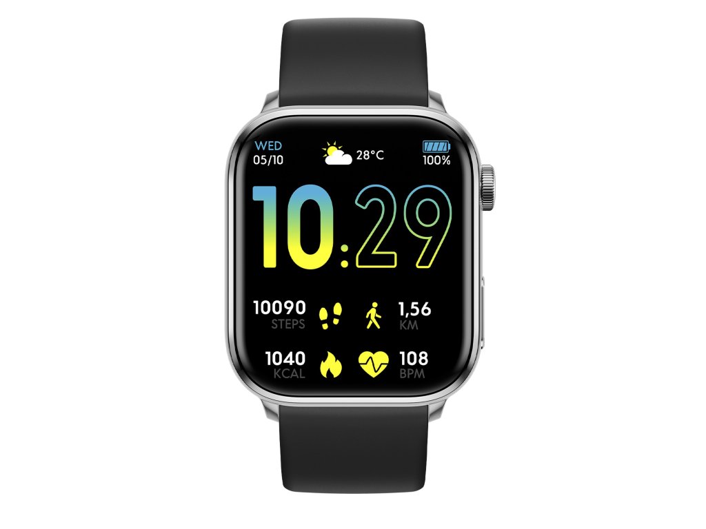 Tieto hodinky majú moderné hranaté hliníkové puzdro a pohodlný čierny silikónový remienok, ktorý zaručuje maximálne pohodlie aj pri celodennom nosení. Veľký 1,96 AMOLED displej s rozlíšením 410 × 502 px a uhlopriečkou 49 mm poskytuje ostrý obraz a živé farby. Všetko je teda prehľadné.
