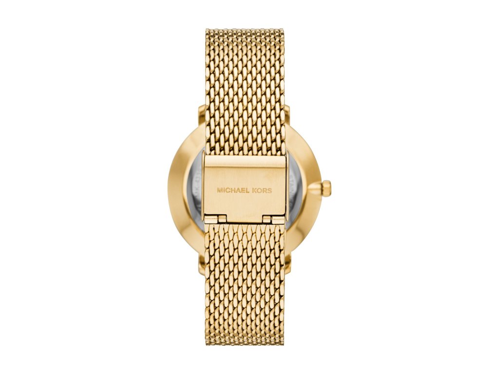 Zlatý lesk ciferníka s priemerom 38 mm zasadeného do úzkeho okrúhleho oceľového puzdra rovnakej farby pôsobí podmanivým a pútavým dojmom. Eleganciu ciferníka umocňujú aj tri tenké ručičky, nadčasové indexy a drobné trblietavé kryštáliky, ktoré ho lemujú. Ťahadlo zo sieťoviny z nehrdzavejúcej ocele v zlatej farbe je nielen estetické, ale pôsobí aj veľmi sofistikovane.