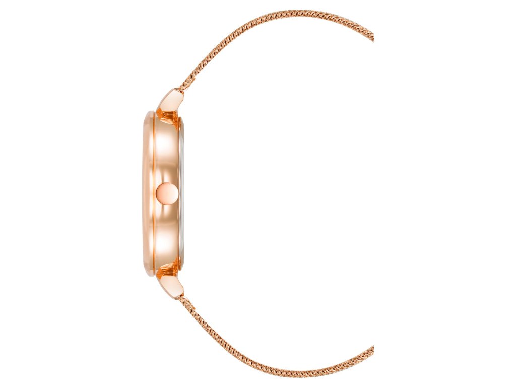 Ružovozlatý remienok zo sieťoviny z nehrdzavejúcej ocele zaručuje výnimočnú odolnosť a pohodlné nosenie, ale zároveň dodáva hodinkám nadčasový vzhľad. Okrúhle puzdro v rovnakej farbe dokonale ladí s celkovým dizajnom hodiniek. Biely ciferník s priemerom 36 mm zdobený motívom farebných a zlatých kvetov prináša živý a svieži vzhľad, ktorý zdôrazňuje ženský pôvab a jemnosť. Ružovo-zlaté ručičky a indexy doplnku dodávajú ohromujúci efekt.
