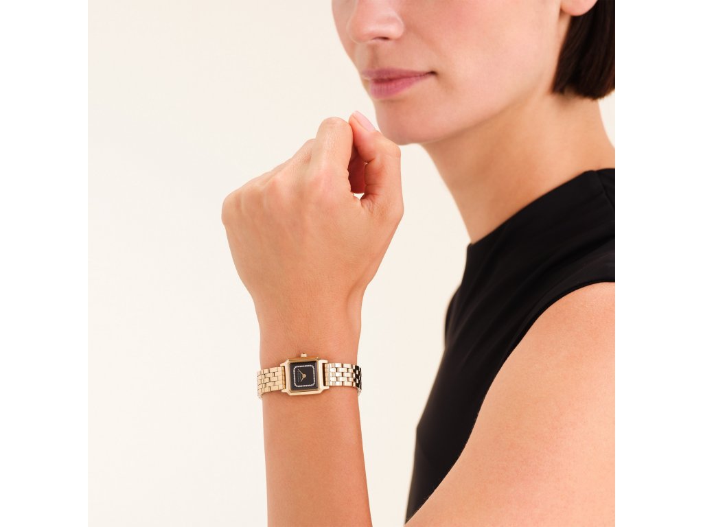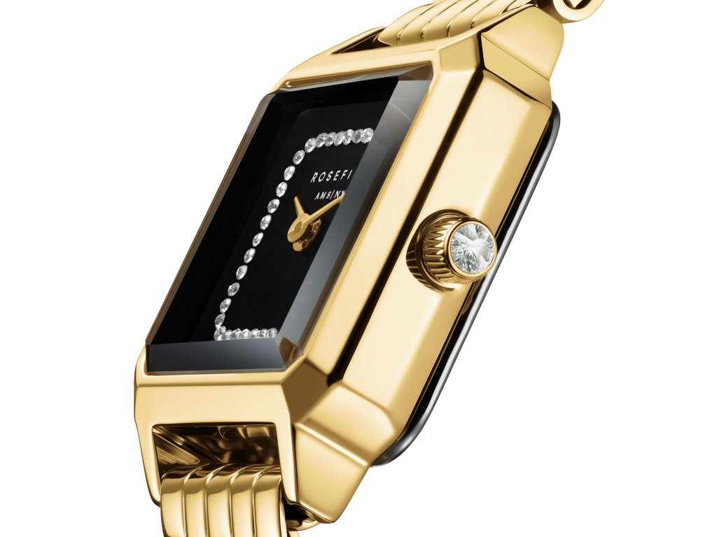 Pozlátené hranaté puzdro dopĺňa čierny ciferník s jemným perleťovým efektom, ktorý je lemovaný radom drobných kryštálov – tento dekor pripomína luxusný rám a opticky zvýrazňuje čistý stred hodiniek. Absencia indexov a zlaté ručičky nechávajú vyniknúť celkovému dojmu minimalistickej elegancie. Oceľový ťah v zlatej farbe dopĺňa prémiový vzhľad, zatiaľ čo quartzový strojček zaisťuje spoľahlivý chod.