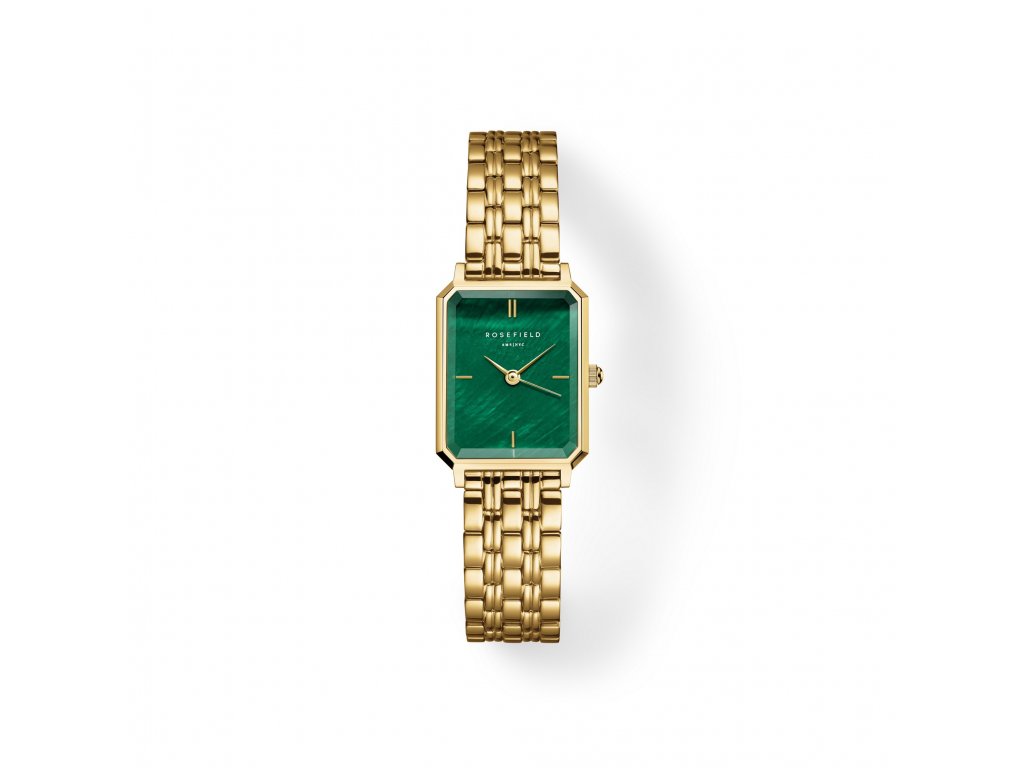 Hodinky zaujmú výrazným smaragdovým ciferníkom s perleťovým povrchom.Na ciferníku sú 3 jemné zlaté ručičky s minimalistickými indexmi.