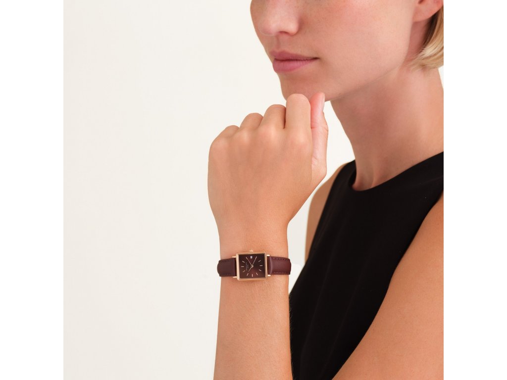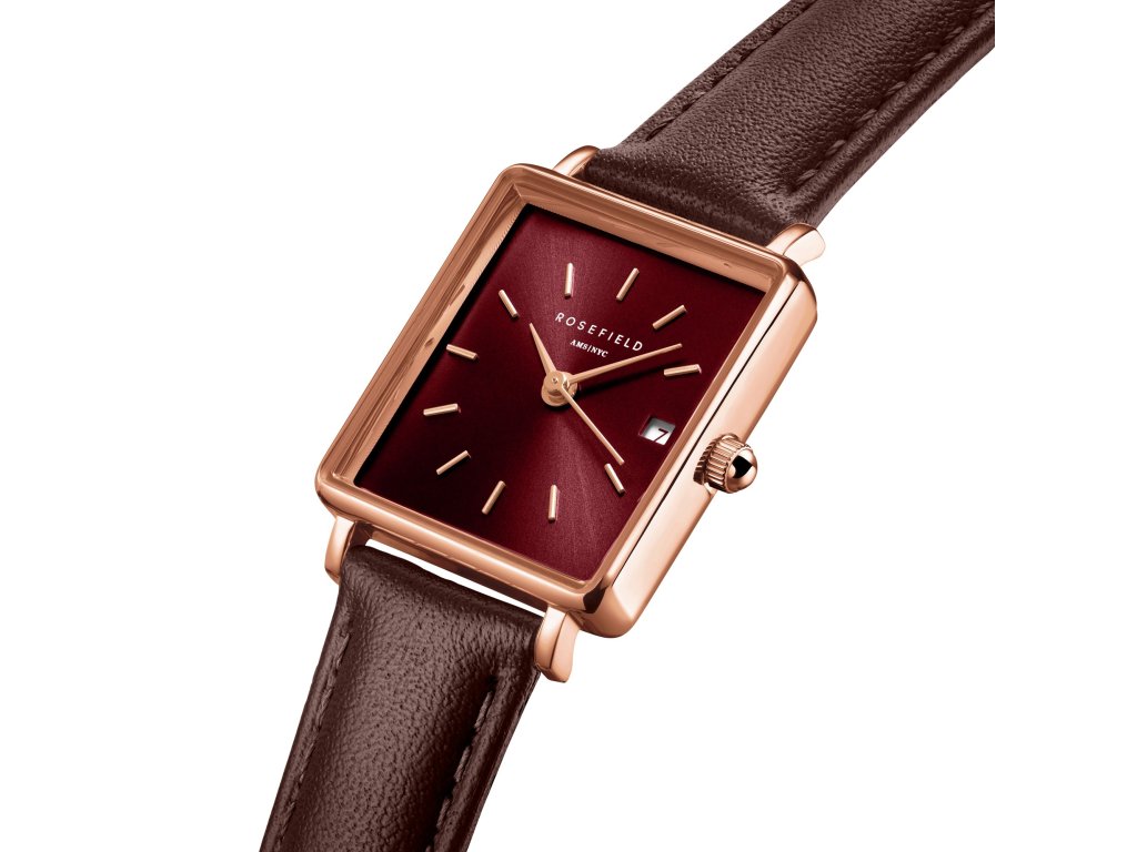 Rôžovozlaté hranaté puzdro v kombinácii s vínovým číselníkom a hnedým koženým remienkom tvorí teplý, vyvážený kontrast, ktorý vynikne najmä na jesenných i elegantných outfitoch. Číselník s jemným sunray efektom mení odtieň podľa dopadu svetla a dodáva modelu hĺbku i šmrnc.