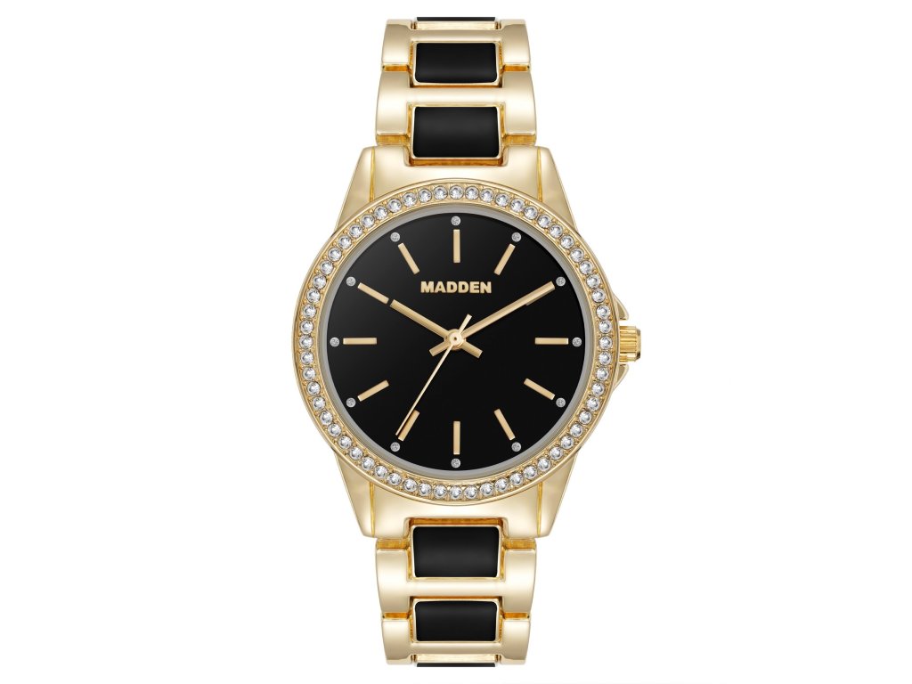 Dámske hodinky od značky Steve Madden v sebe spájajú výrazný pôvab, moderné sebavedomie a ženskú eleganciu. Kombinácia zlato-čiernych tónov, trblietavých kryštálov a tmavého ciferníka pôsobí ako očarujúci šperk, ktorý dodá každému oblečeniu šmrnc a výnimočnosť.