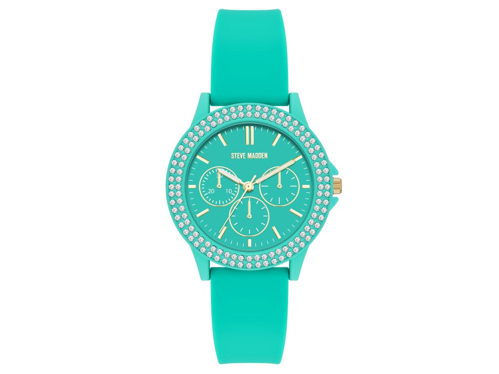 Dámske hodinky od značky Steve Madden v sebe spájajú svieže farby, mladistvý štýl a moderný trblietavý efekt. Tyrkysové prevedenie pôsobí energicky a zároveň elegantne, takže krásne rozžiari každý komplet a dodá mu výrazný módny akcent.