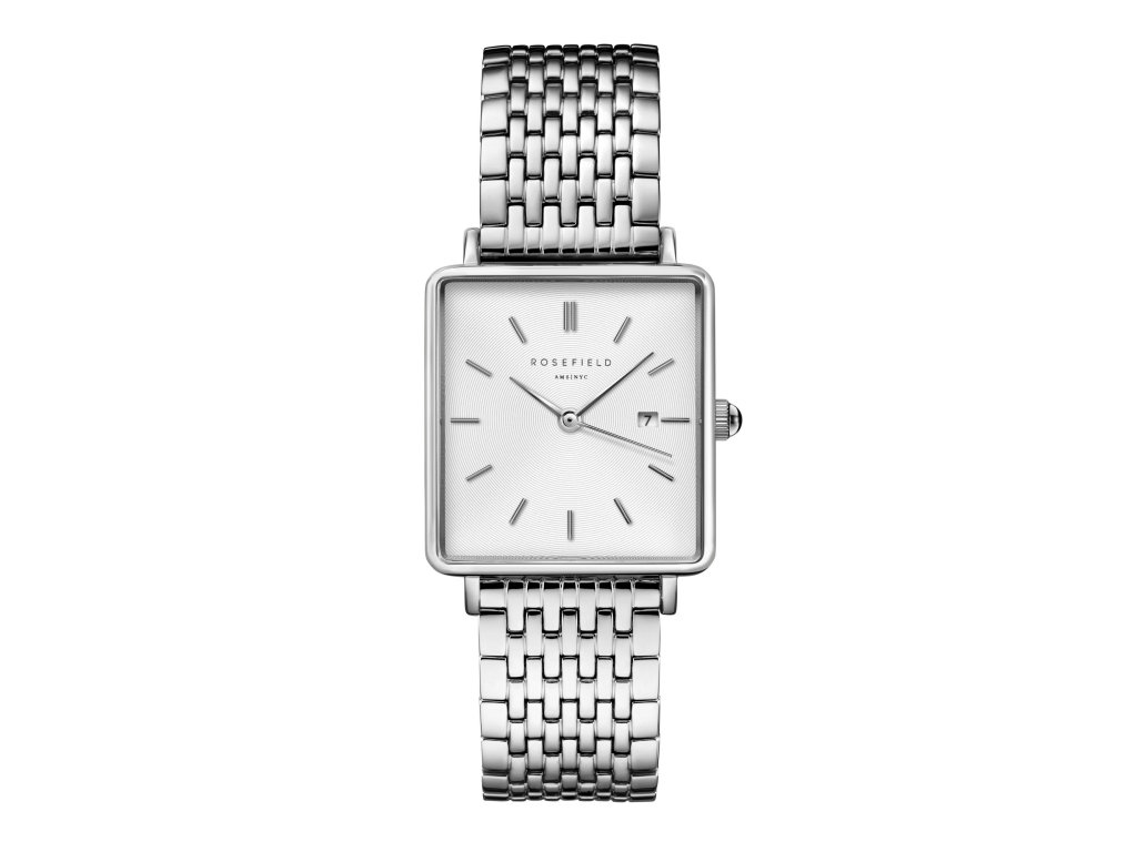 Boxy v striebornom elegantnom dizajne s bielym ciferníkom, dátumovkou a oceľovým ťahomDodatočné parametre