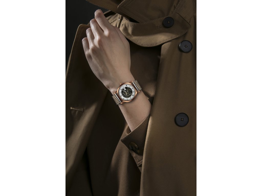 Celokovové prevedenie hodiniek so strieborným a ružovo-zlatým remienkom im dodáva sofistikovanosť a zároveň zaručuje odolnosť. Puzdro v rovnakej farebnej kombinácii dokonale ladí s bielym okrúhlym ciferníkom s priemerom 36 mm. Rímske číslice v čiernej farbe s postriebrenými ručičkami vytvárajú očarujúci kontrast.