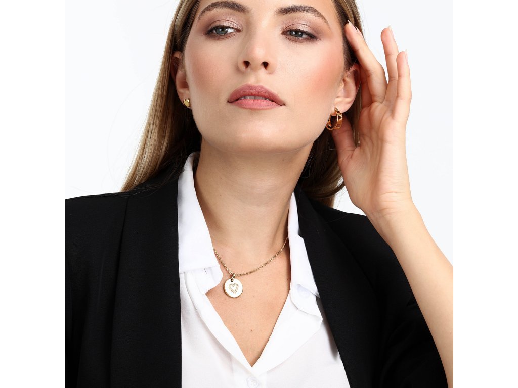 Obsahuje štýlový náhrdelník s príveskom srdca s čírymi kryštálmi a dve jednoduché náušnice, jednu s kameňom a druhú v tvare kruhu. Šperk je vyrobený z pozlátenej ocele a vďaka svojej symbolike je vhodný ako darček k narodeninám, výročiu alebo ako prejav lásky.
