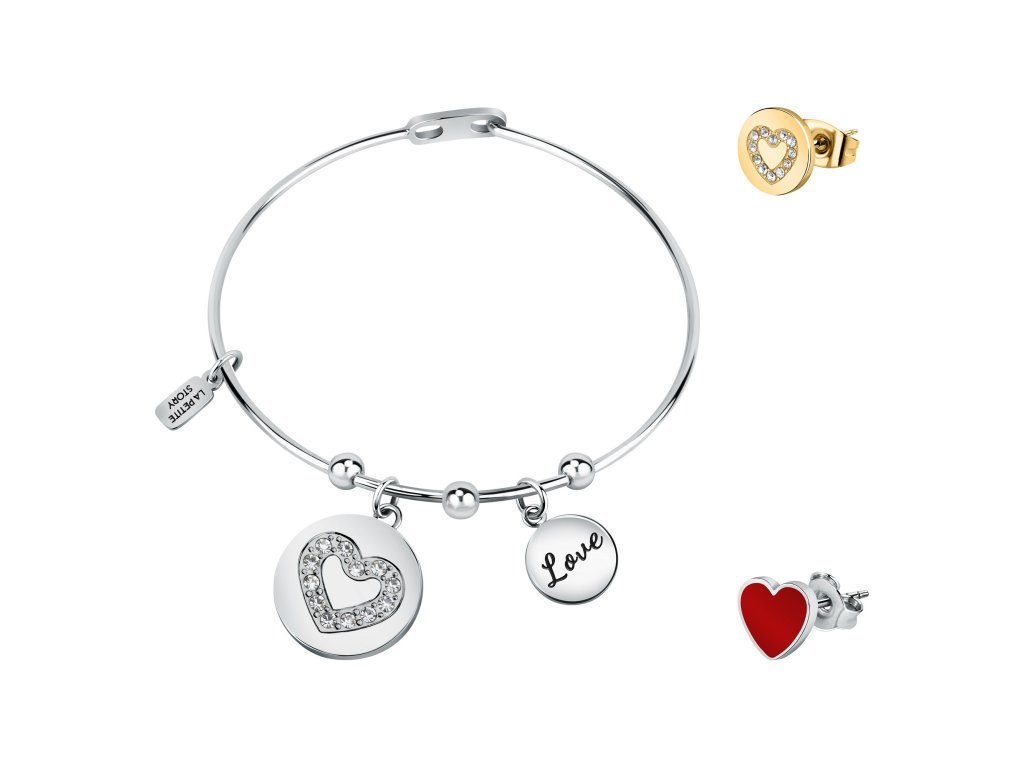 Darčeková súprava obsahuje pevný náramok s príveskom srdiečka v kruhu s čírymi kryštálmi, druhý prívesok je okrúhly s textom LOVE a dve jednoduché náušnice. Jeden so srdcom v kruhu s čírymi kryštálmi v žltej farbe, druhý v tvare srdca je zdobený červeným smaltom.