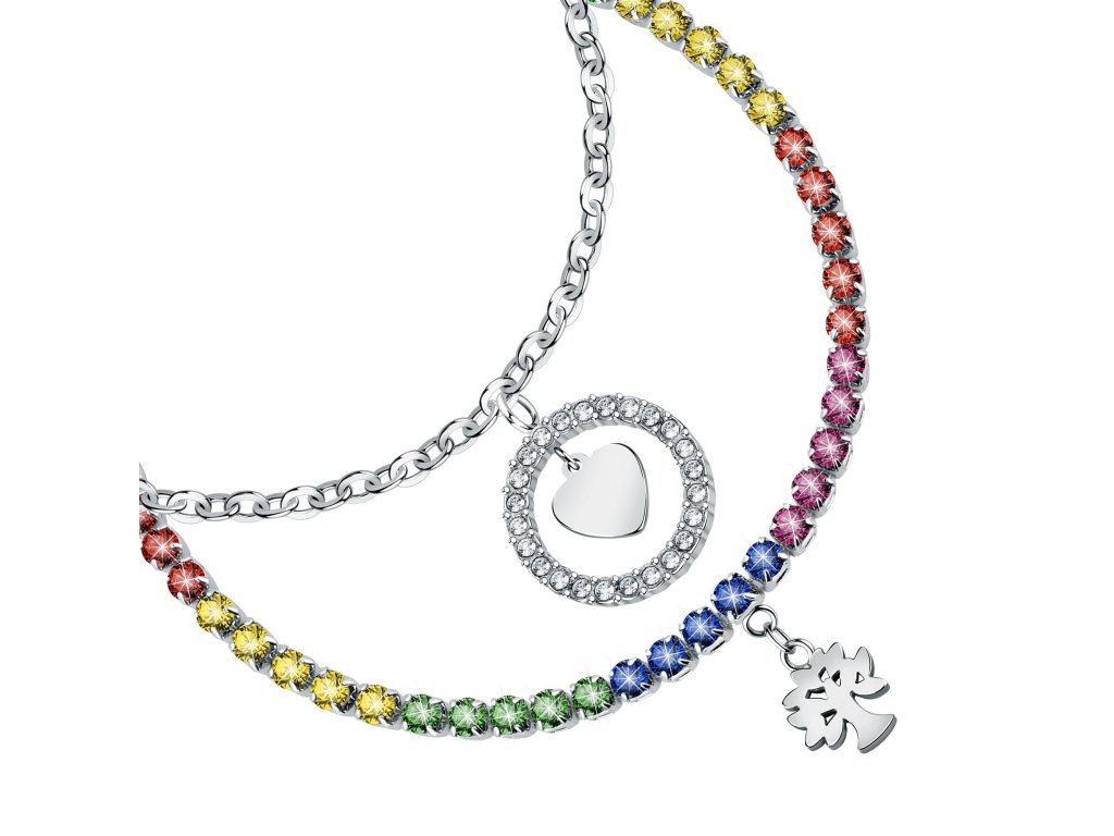 Jeden náramok je zdobený farebnými kryštálmi a druhý príveskom so symbolom srdca. Náušnice v tvare srdca s kryštálom z kubických zirkónov svojím šarmom dopĺňajú celú súpravu.