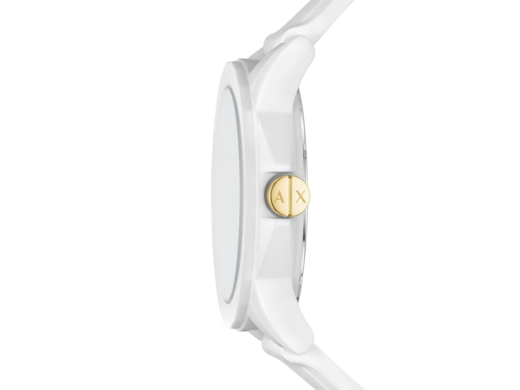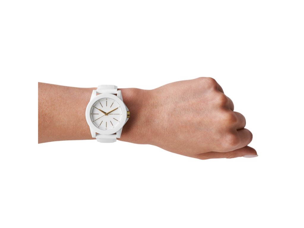 Súprava doplnkov na doladenie vášho štýlu doma aj na cestách, to sú biele dámske hodinky v mestskom štýle a remienok na batožinu od značky Armani Exhange.