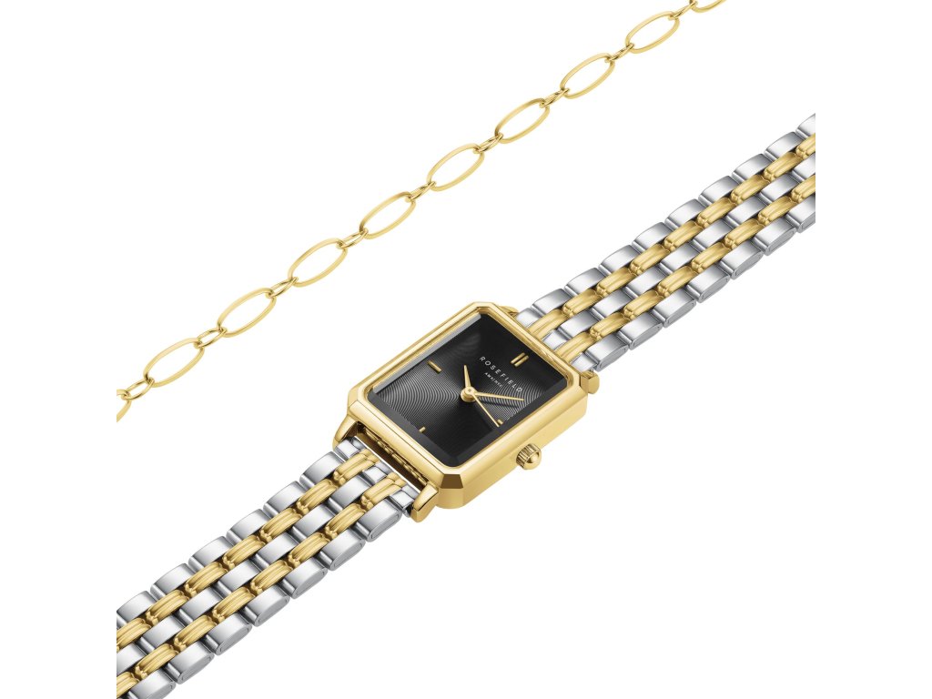 Hodinky s hranatým puzdrom v zlatej farbe a čiernym ciferníkom pôsobia decentne, ale upútajú pozornosť. Dvojfarebný oceľový ťah kombinuje strieborný a zlatý tón pre univerzálny a napriek tomu moderný vzhľad. Náramok zaujme oválnymi článkami a ladí s hodinkami do posledného detailu.
