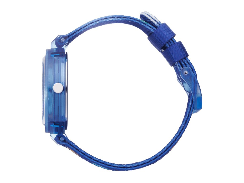 Na tmavomodrom ciferníku veľmi pekne vyniknú biele číslice v svetlomodrých kruhoch a logo značky v hornej časti ciferníka. Veľké číslice umožňujú ľahkú orientáciu v čase, rovnako ako svetlomodré, biele a žlté ručičky. Ciferník je zasadený do modrého plastového puzdra s priemerom 32 mm a modrým nylonovým remienkom, na ktorom vyniknú jednotlivé planéty.