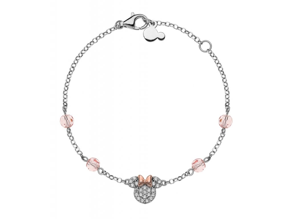 Strieborný náramok s príveskom v tvare myšky Minnie je ideálnym darčekom pre všetkých milovníkov rozprávok Disney. Prívesok je zdobený kryštálmi, ktoré dopĺňajú ružové korálky po obvode obruby. Vyrobené zo striebra 925/1000.