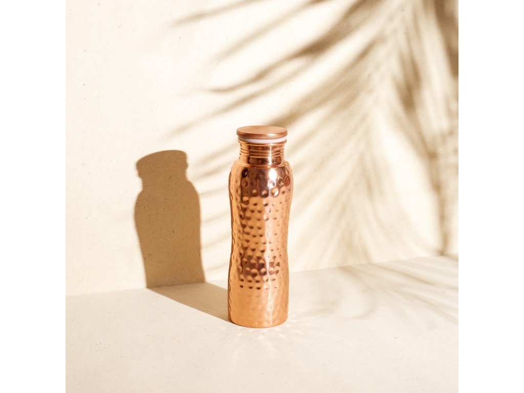 Zaobstarajte si štýlovú a praktickú fľašu z medi, známej svojimi antibakteriálnymi vlastnosťami a odolnosťou. Meď je ušľachtilý kov, ktorý má podľa ajurvédy liečivé účinky na ľudské telo.