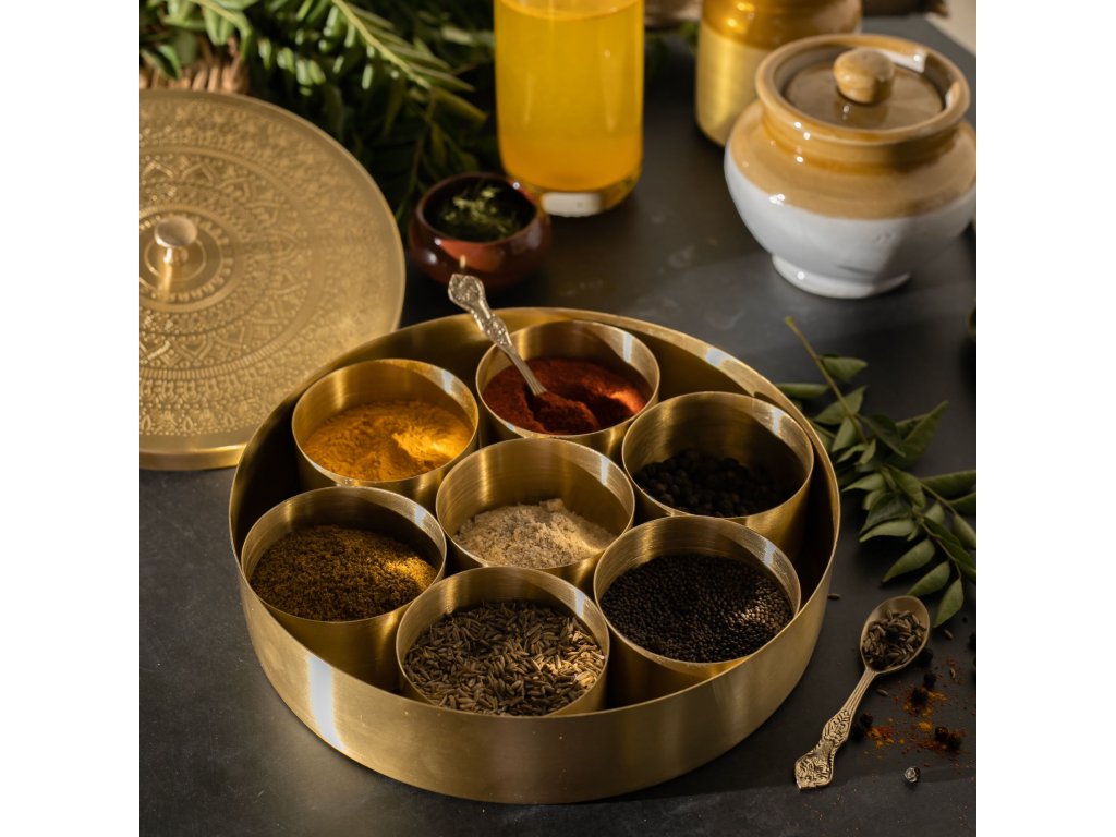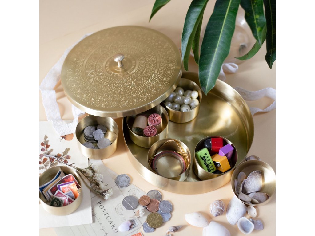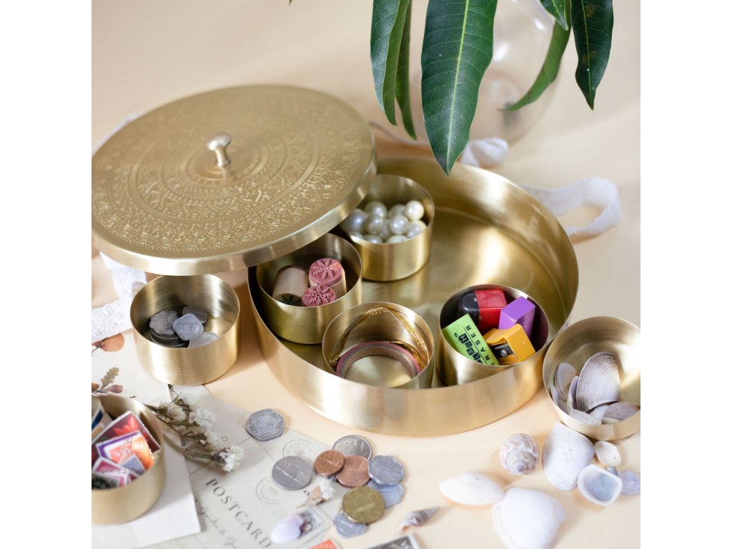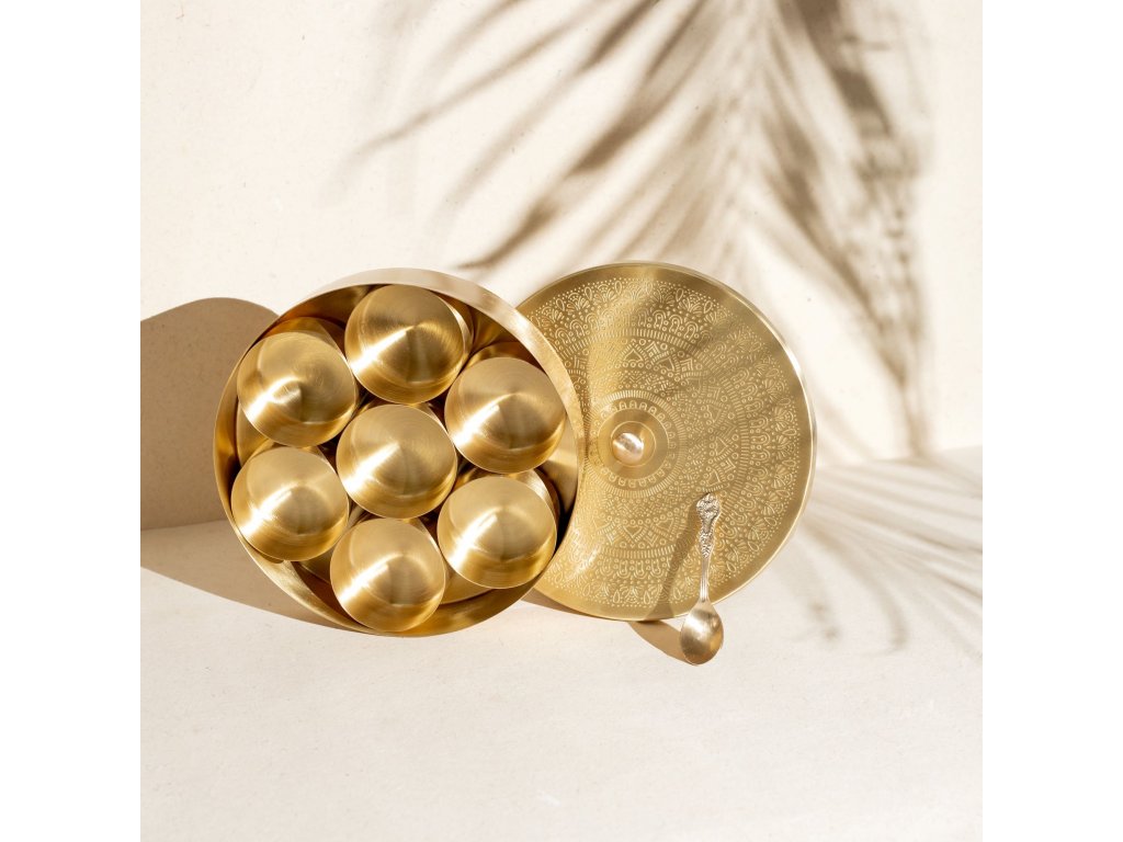 Multifunkčná súprava 7 mosadzných misiek elegantne uložených v jednej veľkej miske s vekom, ktorú môžete použiť na estetické servírovanie jedla alebo na elegantné uloženie rôznych drobností.Dodatočné parametre