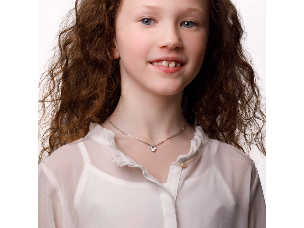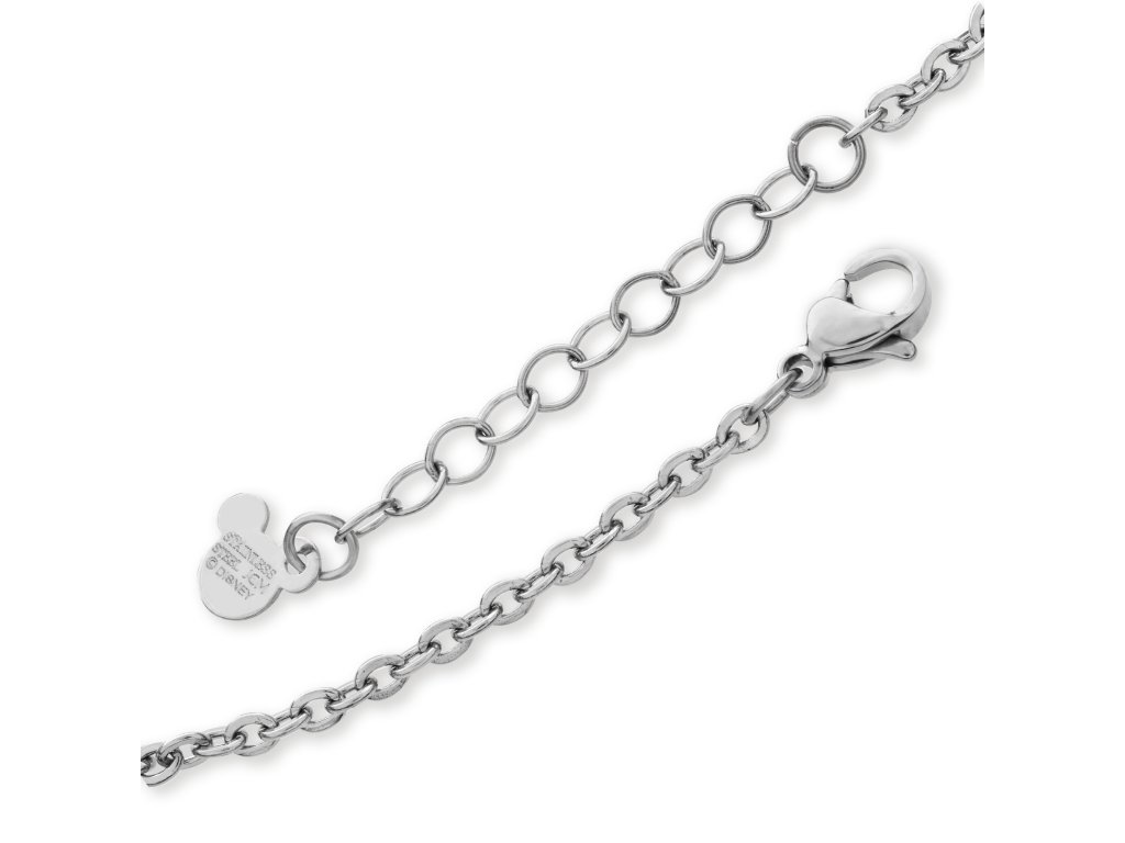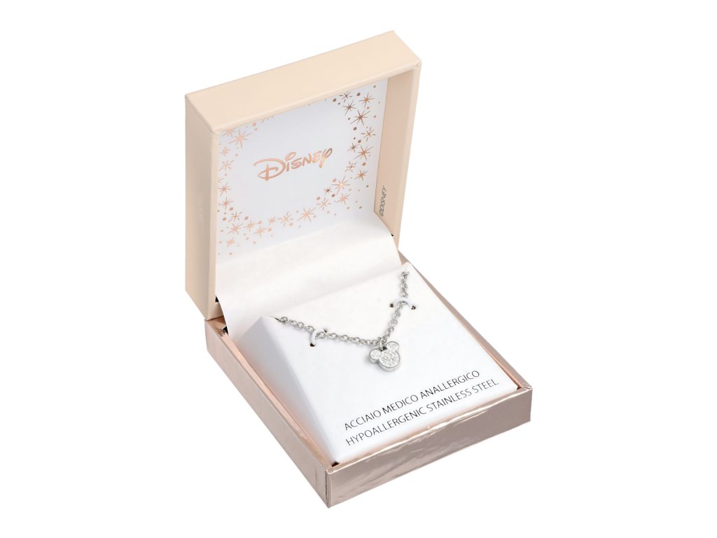 Náhrdelník s príveskom v tvare hlavy obľúbenej postavičky Mickey Mouse z Disney je vyrobený z nehrdzavejúcej ocele s lesklou povrchovou úpravou. Prívesok je zdobený čírymi kryštálmi, ktoré spolu s oceľou veľmi pekne ladia. Maximálna dĺžka náhrdelníka je 40,5 cm. Dodáva sa v štýlovej škatuli.