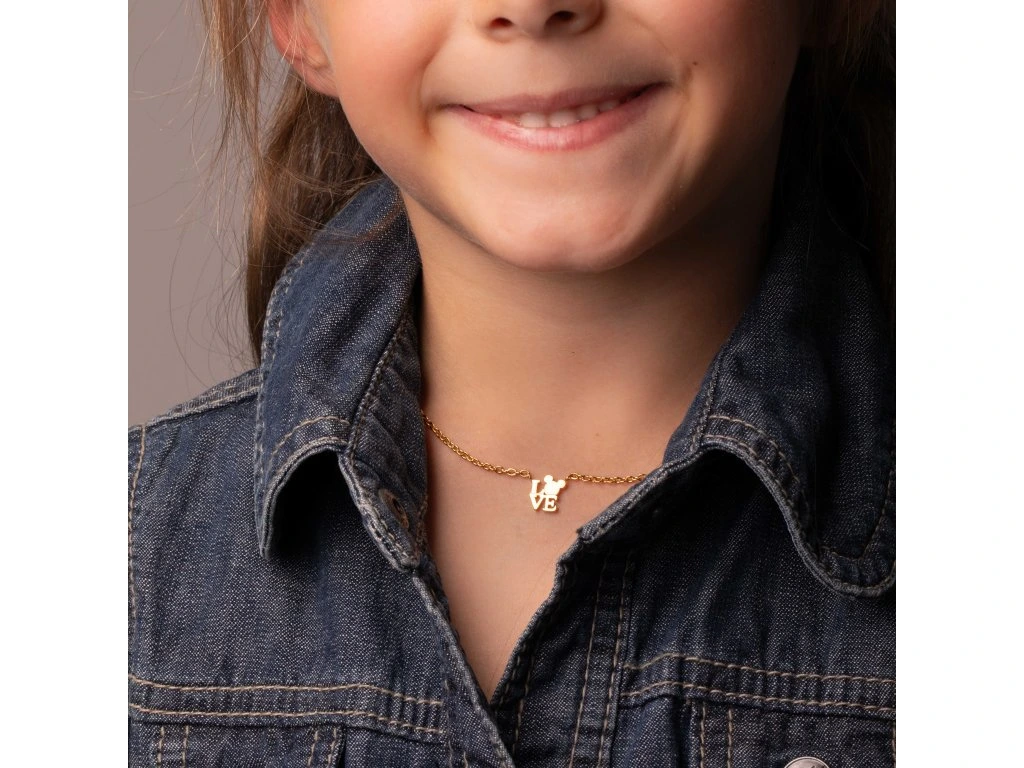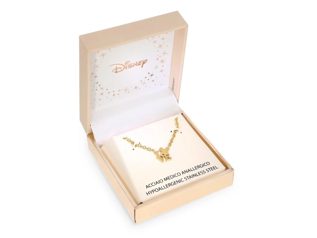 Tento náhrdelník s príveskom v tvare slova Love s hlavou postavičky Mickey Mouse z webovej stránky Disney, je vyrobený z pozlátenej nehrdzavejúcej ocele s lesklým povrchom. Lesk tohto náhrdelníka je skutočne pôsobivý. Maximálna dĺžka reťaze je 40 cm. Dodáva sa v štýlovej škatuli.