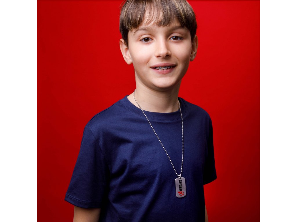 Náhrdelník na prvý pohľad zaujme oceľovým príveskom v tvare vojenskej psej známky s nápisom AVENGERS. Povrch dosky je potiahnutý vysokokvalitnou PVD vrstvou na zachovanie lesku a odolnosti. Prívesok je na štýlovej guľôčkovej retiazke z nehrdzavejúcej ocele, je zakončený karabínkou a má dĺžku 56 cm.