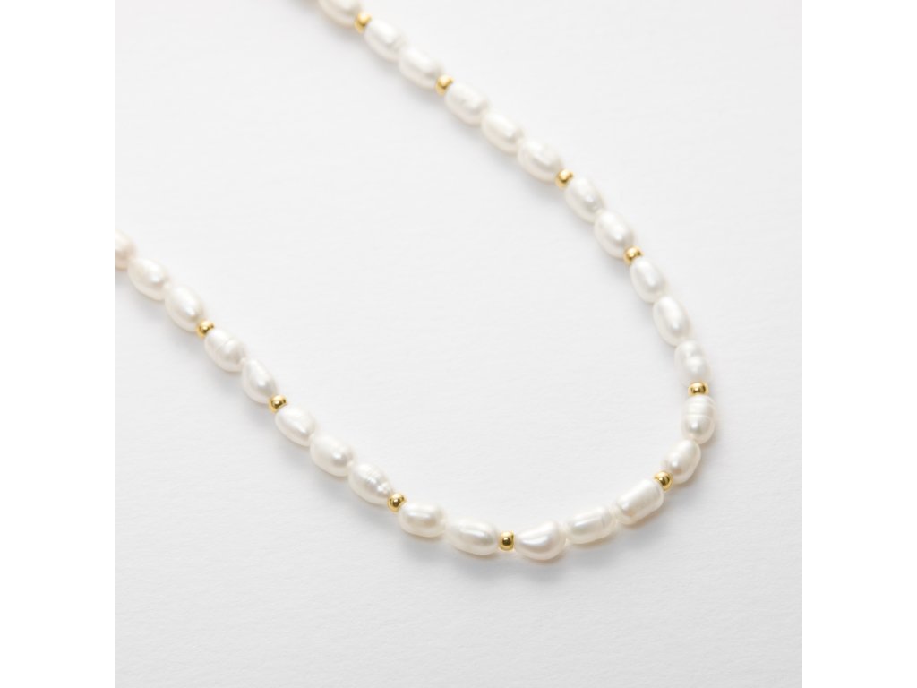 Medzi sladkovodnými perlami sa nachádzajú malé zlaté guľôčky. Dĺžku reťaze môžete nastaviť.