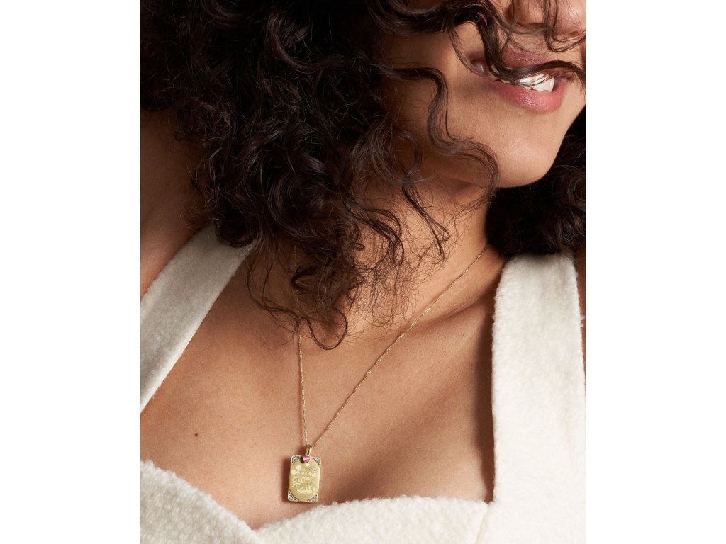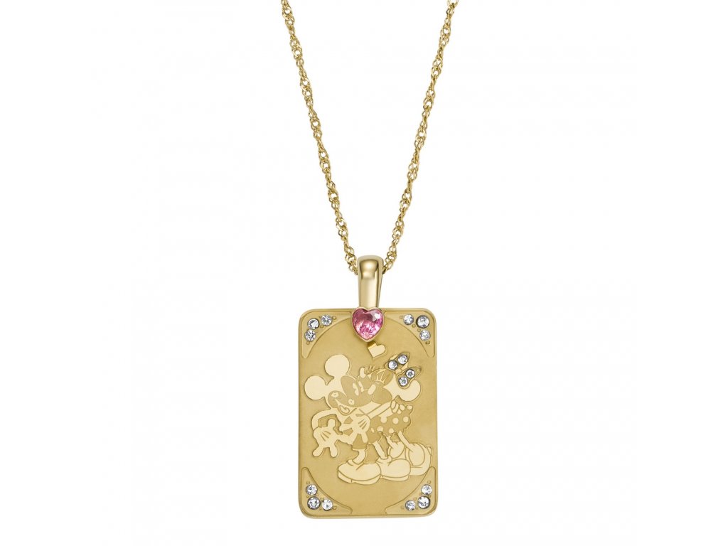 Neprehliadnuteľným prvkom šperku je obdĺžniková doštička, z ktorej vystupuje reliéf zamilovaných myšiakov Mickeyho a Minney. Tanier je tiež zdobený žiariacimi kryštálmi a ružovým srdiečkom. Šperk je vyrobený z pozlátenej nehrdzavejúcej ocele a je veľmi štýlovo zabalený v krabičke v tvare srdca. Nádherný darček.