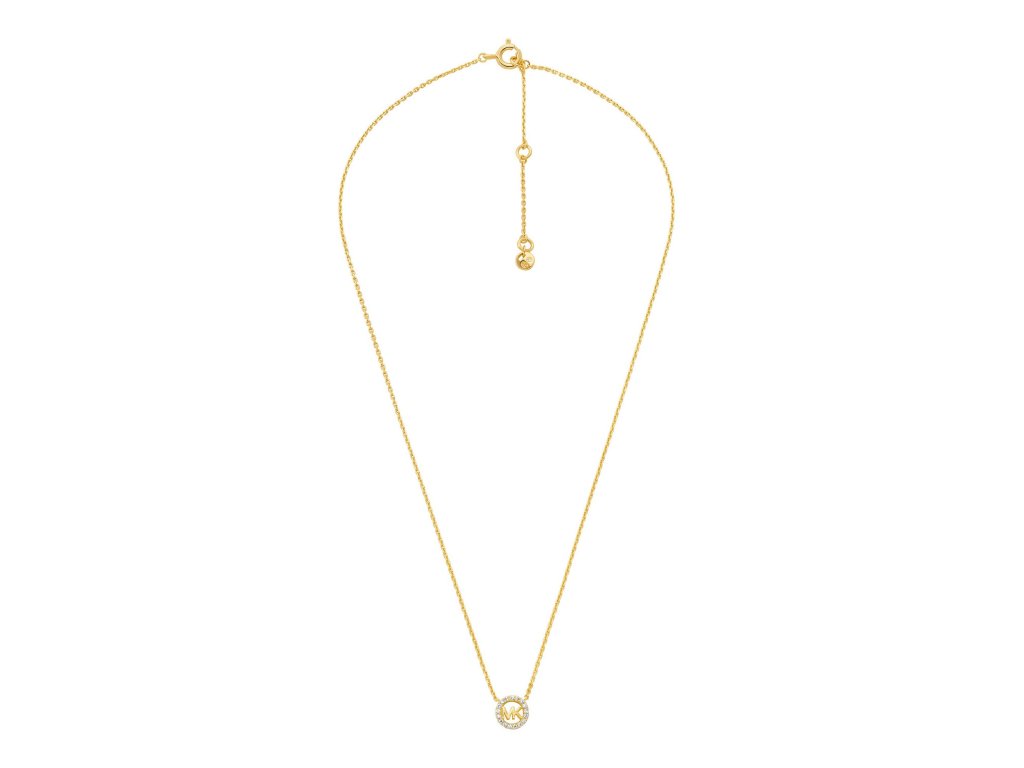 Náhrdelník je vyrobený zo striebra, ktoré je pozlátené. Retiazka v atraktívnom dizajne je korunovaná ornamentom s logom MK, ktorý je po obvode zdobený trblietavými zirkónmi. Zvolená farba a lesk kryštálov robia z náhrdelníka luxusný doplnok, ktorý doslova vyzdvihne váš štýl. Šperk je vyrobený zo striebra 925 a váži 2 g.