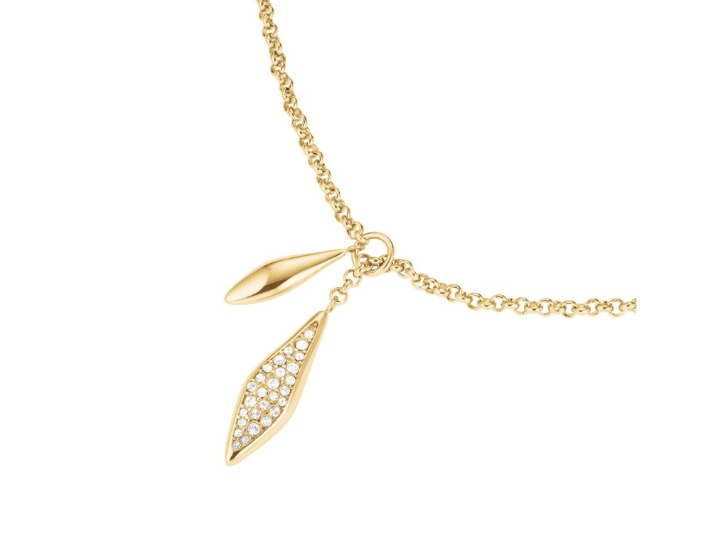 Dlhší prívesok osadený kryštálmi dopĺňa kratšia hladká ozdoba bez kryštálov, čím vzniká zaujímavý kontrast, ktorý ladí s líniou výstrihu. Náhrdelník nemá klasické zapínanie – jeho dĺžku si jednoducho upravíš posúvaním retiazky, takže ho môžete nosiť presne tak, ako potrebujete.