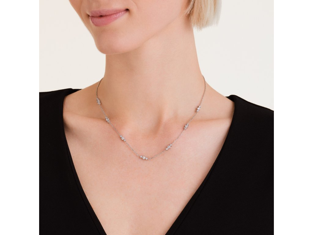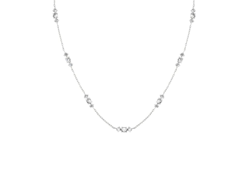 Náhrdelník Triple Crystals Necklace upúta rafinovaným zdobením v podobe siedmich elegantných trojíc čírych kryštálov, ktoré sú jemne rozmiestnené po celej dĺžke retiazky. Tento štýlový detail dodáva šperku sofistikovaný lesk a nadčasovú ženskú energiu.