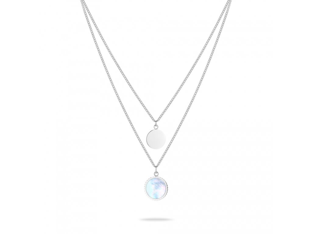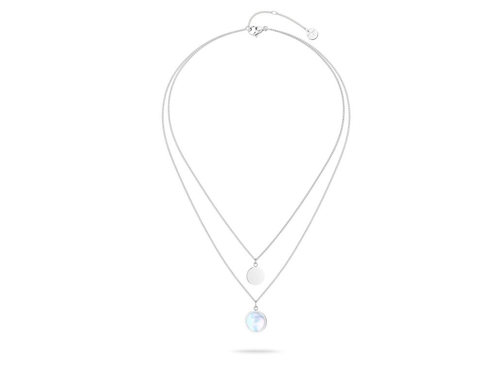 Štýlový dámsky náhrdelník od nemeckej značky Tamaris sa skladá z dvoch retiazok. Kratší je minimalistický peniaz, dlhší je osadený krásnou perlou.
