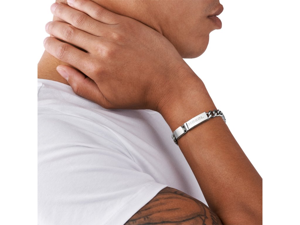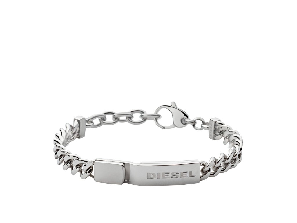 Podobá sa reťazi, ktorú prekrýva tabuľka s nápisom Diesel. Spona má štýlovú karabínku, takže jej dĺžku môžete prispôsobiť veľkosti svojho zápästia.