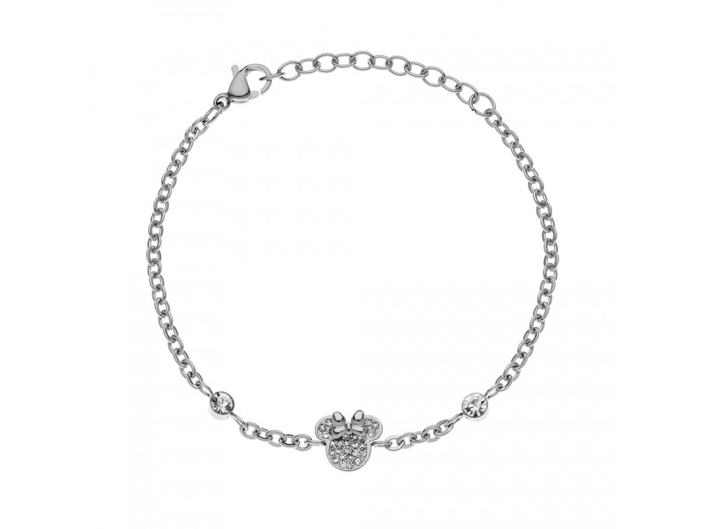 Disney Náramok Minnie Mouse je vyrobený z nehrdzavejúcej ocele s lesklým povrchom. Hlava myšky Minnie je zdobená čírymi kryštálmi, ktoré v kombinácii s farbou ocele vyzerajú naozaj krásne. Zaujímavým detailom sú aj dva kryštály čírej farby, ktoré náramok zdobia a dodávajú mu nádych rafinovanosti. Maximálna dĺžka náramku je 17 cm. Dodáva sa v štýlovej škatuli.
