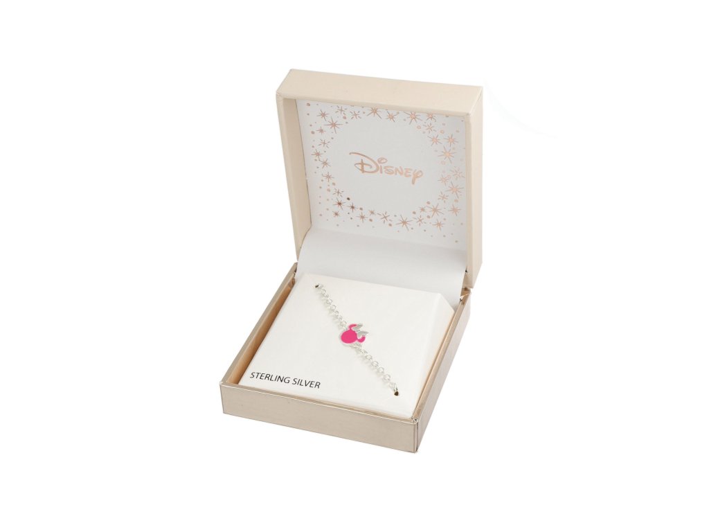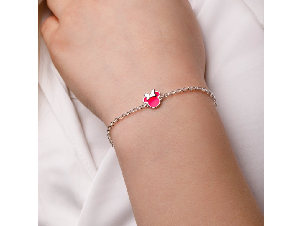 Náramok zdobený hlavou myšky Minnie z Disney je vyrobený z kvalitného striebra s lesklou povrchovou úpravou. Hlava myšky Minnie je zdobená ružovým smaltom, ktorý na náramku vyniká. Maximálna dĺžka náramku je 17 cm. Dodáva sa v štýlovej škatuli. Hmotnosť šperku je 2,5 g.