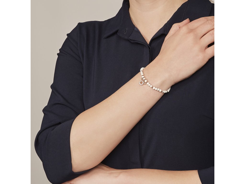 Základ náramku tvoria svetlé magnezitové korálky, ktoré podporujú vnútorný pokoj. Každý korálik je iný, vďaka čomu je náramok jedinečným šperkom. Decentný kontrast potom vytvárajú ďalšie prívesky a detaily v ružovom zlate, ktoré sú navyše jemne zdobené kryštálmi.