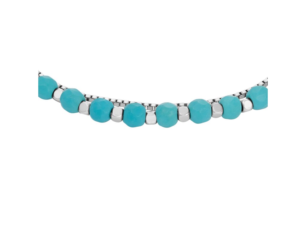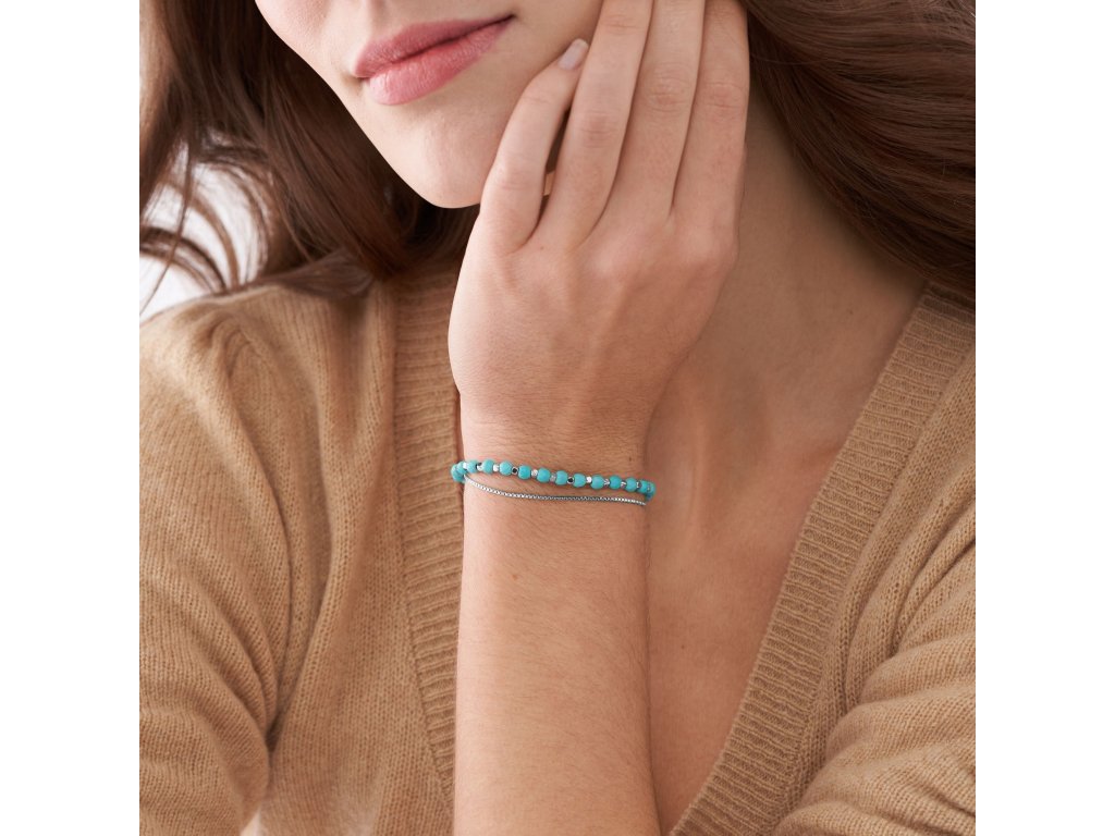 Štýlový a dokonale kombinovateľný je dámsky dvojitý náramok z Fossil, ktorého základ tvoria tyrkysové korálky.