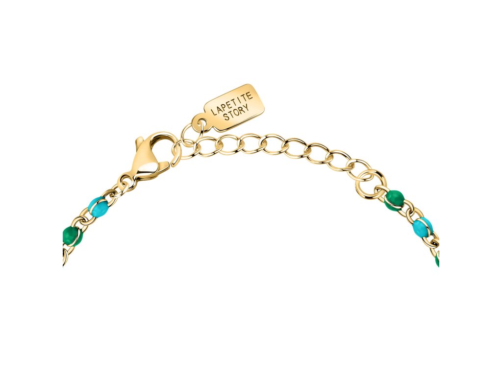 Je vyrobený z pozlátenej nehrdzavejúcej ocele, korálky sú zo smaltu. Vďaka nastaviteľnej dĺžke sa dokonale prispôsobí každému zápästiu.