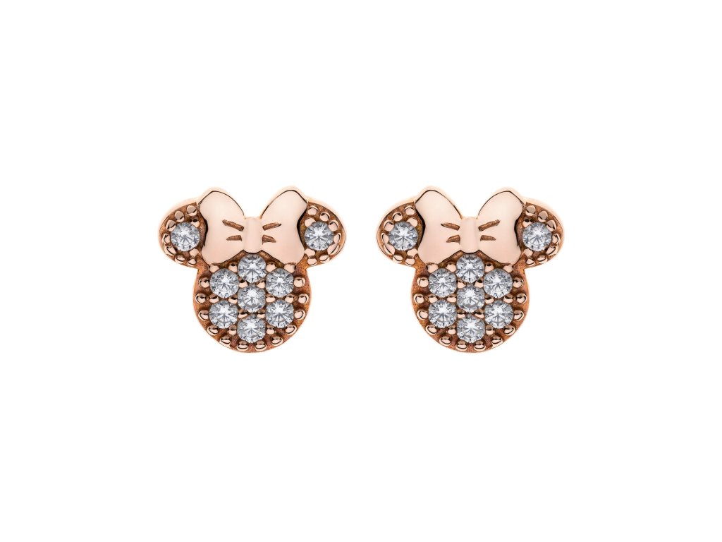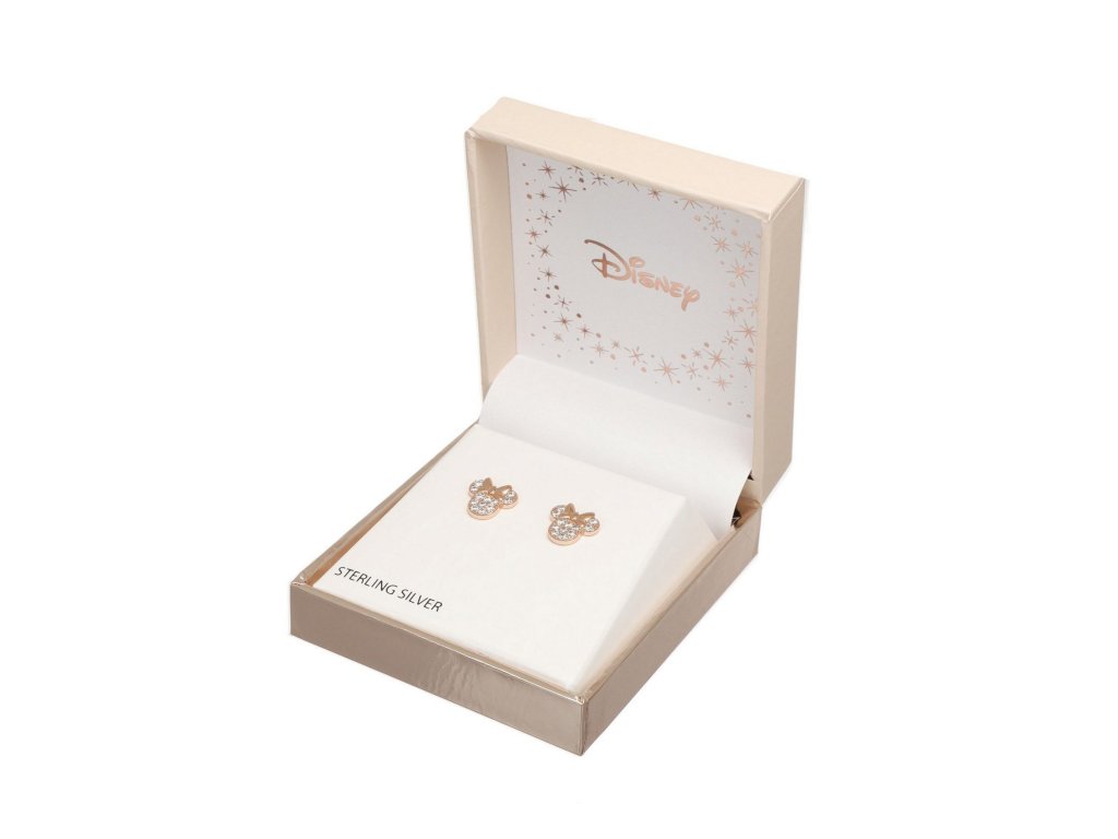 Náušnice v tvare postavičky Minnie Mouse z Disney sú vyrobené z kvalitného striebra 925 s lesklým povrchom a ružovým pozlátením. Sú zdobené čírymi kryštálmi, ktoré na šperku krásne vyniknú. Tieto náušnice sa zapínajú na puzetu, aby sa pohodlne nosili a predišlo sa ich strate. Dodávajú sa v štýlovej škatuli. Hmotnosť šperku je 2,3 g.