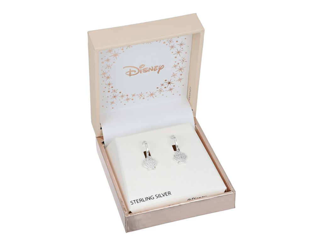 Okrúhlym náušniciam dominuje prívesok s mušľou z Disney. Šperk je vyrobený z kvalitného striebra 925 s lesklou povrchovou úpravou. Obe mušle sú osadené čírymi kryštálmi. Náušnice sa zapínajú na klasický gombík, ktorý zaručuje pohodlné nosenie a zabraňuje ich strate. Tieto detské náušnice sa dodávajú v štýlovej krabičke. Hmotnosť šperku je 2,4 g.