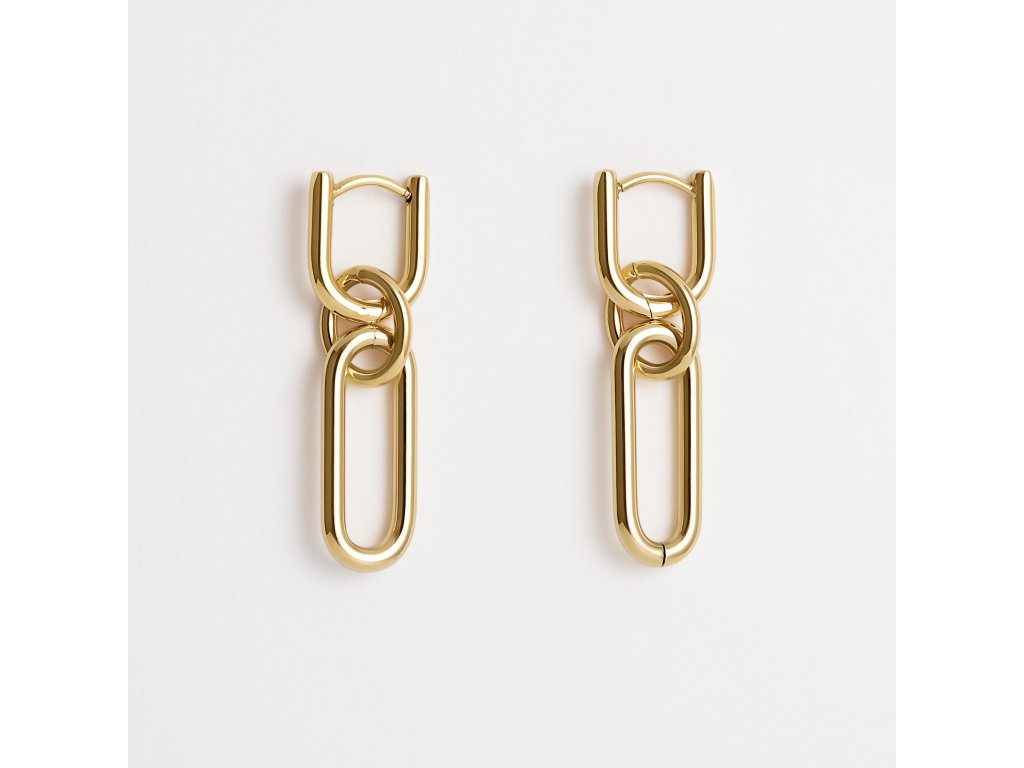 Tieto zlaté náušnice sú pôsobivo zložené z troch oddeliteľných častí, ktoré umožňujú šperku dodať rôzny vzhľad. Stačí odstrániť iba dva spodné články. Základ tvorí spona s polodlhým rámčekom, na ktorom je zavesený malý krúžok pripomínajúci prsteň. Po tejto časti nasleduje ďalší článok, oválny. Šírka týchto náušníc je 8 mm, hrúbka 1,9 mm a hmotnosť 5,6 g. Aby ste zachovali krásu týchto náušníc, nevystavujte ich vode, vlhkosti, slnku, teplu, chemikáliám, kozmetike ani drsným čistiacim prostriedkom. V prípade potreby ich vyčistite mäkkou handričkou, ktorá nepúšťa vlákna; pri silnejšom znečistení použite horúcu vodu.