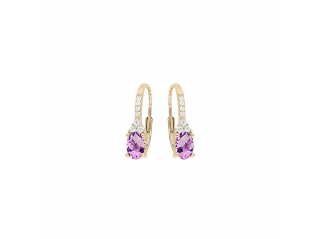 Dámske náušnice od značky Kalace vynikajú harmonickou kombináciou jemného dizajnu a ženskej farebnosti. Svetlofialový ametyst doplnený čírymi kryštálmi kubickej zirkónie dodáva šperku jemný farebný akcent a podčiarkuje jeho nadčasový charakter. Visacie prevedenie spolu so zlatým tónom pôsobí elegantne a ľahko.