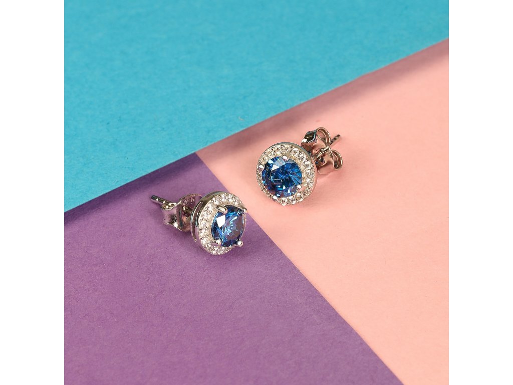 V strede náušníc je tmavomodrý zirkón, ktorý je obklopený drobnými čírymi zirkónmi, čo vytvára krásny kontrast a dodáva náušniciam jedinečný vzhľad. Náušnice sú vyrobené z kvalitného striebra 925/1000 a majú puzetové zapínanie, takže sa pohodlne a bezpečne nosia. Náušnice vážia 1,3 g.