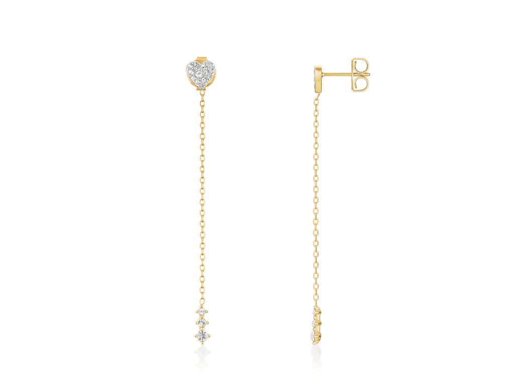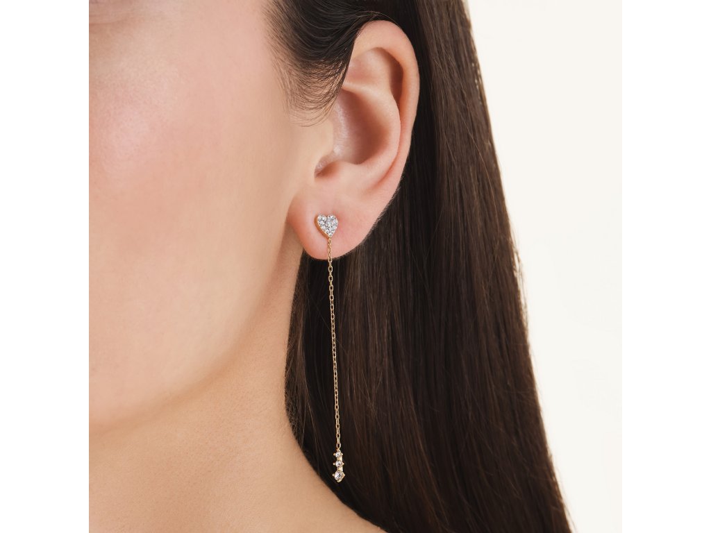 Kryštály rôznych veľkostí zdobia dekor srdca na puzetke aj závesné zakončenie. Jemná retiazka z pozlátenej nehrdzavejúcej ocele dodáva šperku vzdušnosť a ženský nádych. Náušnice majú dĺžku 6,4 cm a zabezpečujú výrazný, ale pritom elegantný efekt.